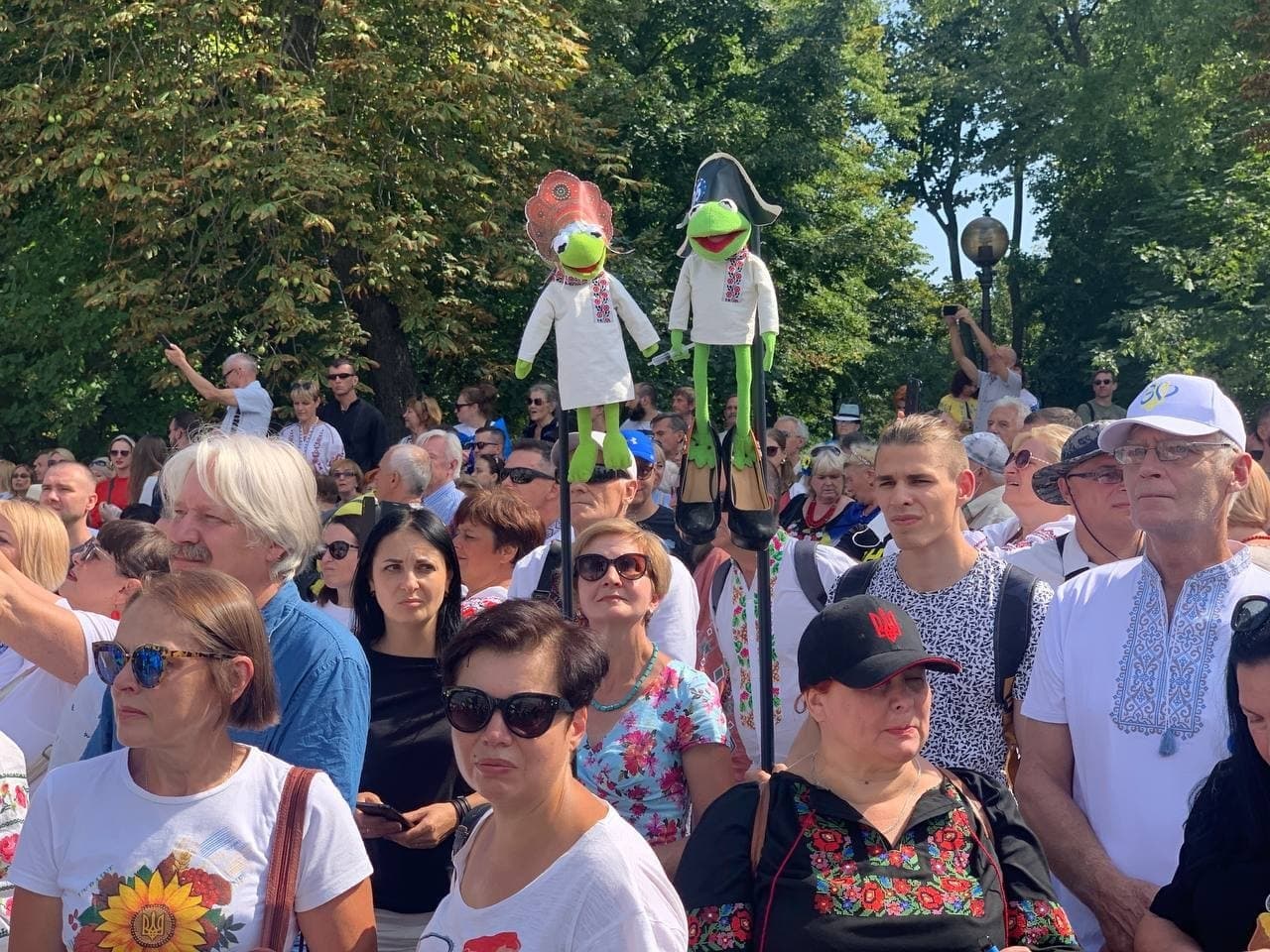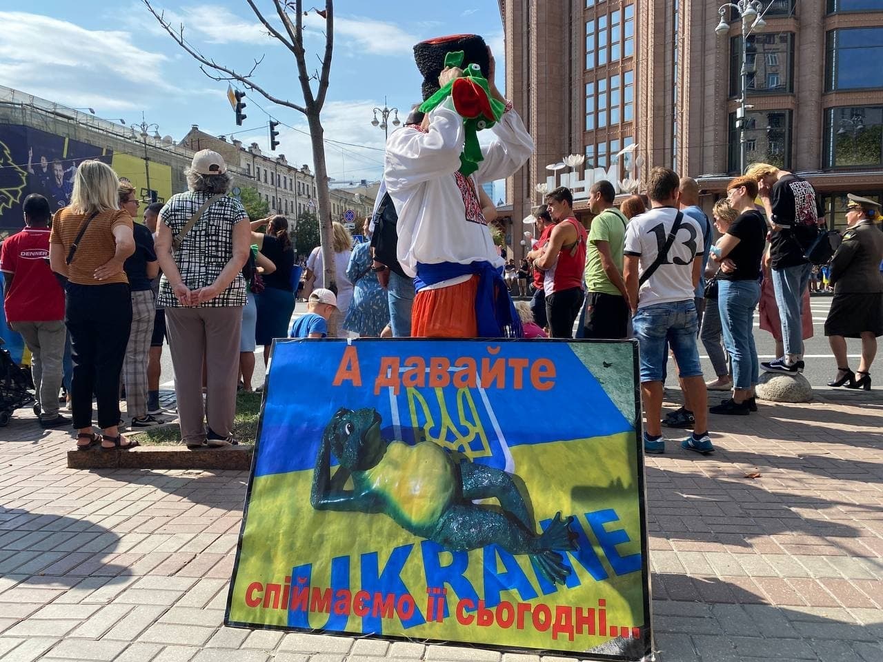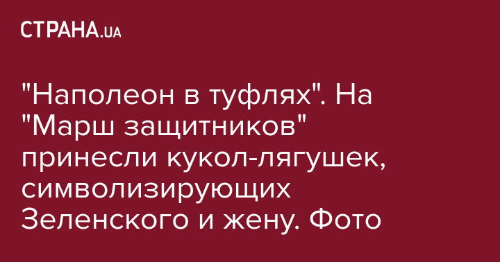 Во вторник, 24 августа, участники "Марша защитников Украины" принесли куклы и картинки с лягушками. По их словам, эти атрибуты символизируют президента Владимира Зеленского и его супругу Елену.