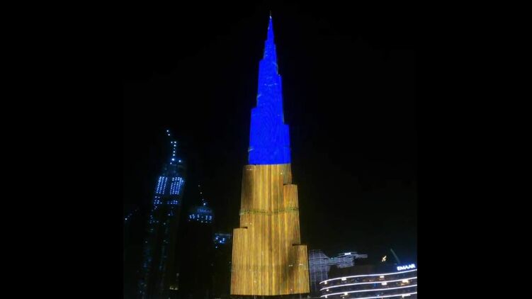 "Бурдж Халифа" подсветили сине-желтыми огнями. Фото: Скриншот из видео