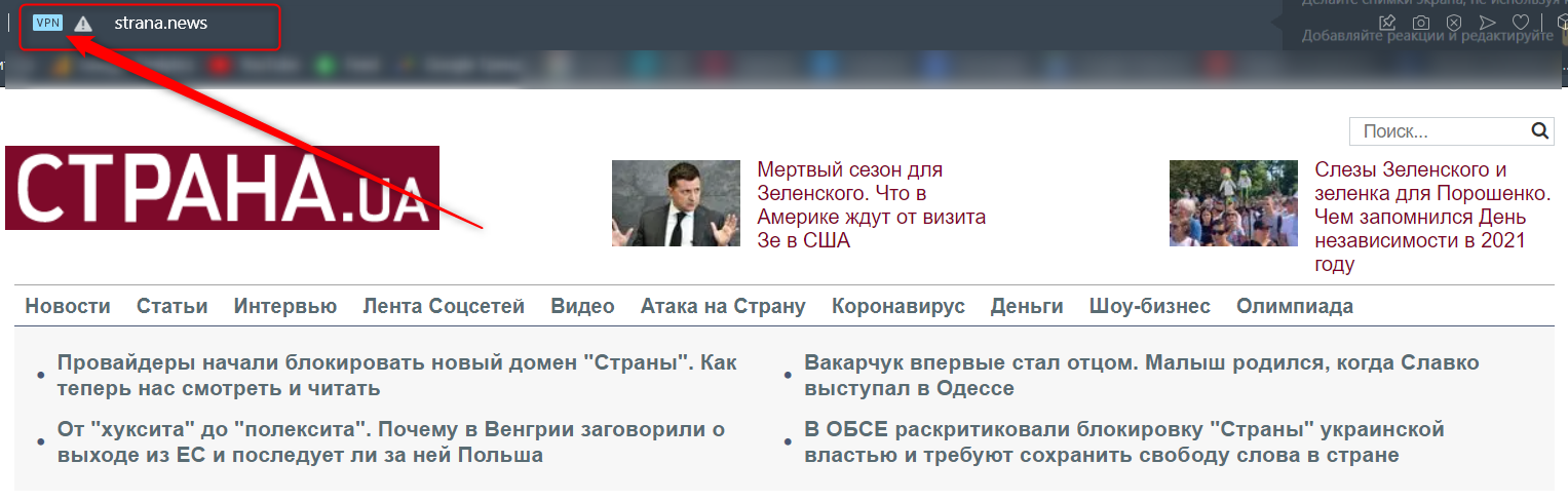 В стране не работают практически все российские онлайн-медиа. А недавно в Украине начали закрывать украинские СМИ. Так, в пятницу, 20 августа, компания-регистратор еще до выхода указа президента о санкциях незаконно заблокировала домен "Страны" - strana.ua. После чего наш сайт переехал на новый домен - strana.news. Но через несколько дней власти обязали провайдеров заблокировали и его. Хотя в указе президента и решении СНБО ничего не говорится о необходимости блокирования сайта strana.news.