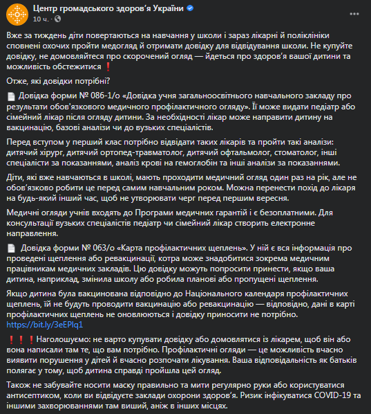 Накануне 1 сентября в Центре общественного здоровья при Минздраве напомнили украинцам, что для посещения школ необходимо подготовить медицинские справки, а также рекомендовали не покупать их, а на самом деле пройти нужные осмотры и сдать анализы.