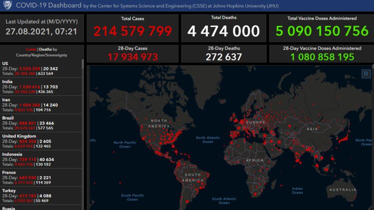 По данным университета Джона Хопкинса на 08:00 утра пятницы в мире коронавирус выявили у 214 579 799 человек. Умерло с начала пандемии 4 474 000 миллиона.