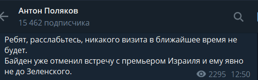 Байден уже отменил встречу с премьером Израиля и ему явно не до Зеленского", - написал он у себя в Телеграм.