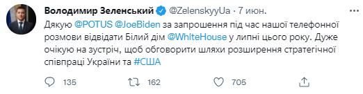 Зеленский поблагодарил Байдена и сообщил, что ожидает встречи с ним. Он конкретизировал, что встреча должна состояться в июле.