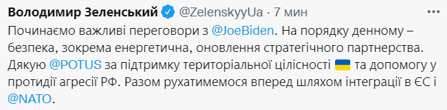 21:15  Зеленский в Твиттере написал, что переговоры начинаются. Темы - безопасность, энергетика, "обновление стратегического партнерства".