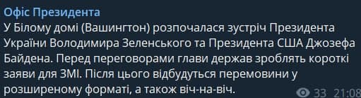 21:10  Офис президента Украины говорит, что встреча с Байденом началась. И прямо сейчас лидеры стран должны сделать короткие заявления для СМИ.