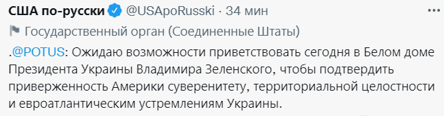 "Я с нетерпением жду возможности приветствовать президента Украины Владимира Зеленского в Белом доме сегодня, чтобы подтвердить приверженность Америки суверенитету, территориальной целостности и евроатлантическим устремлениям Украины".