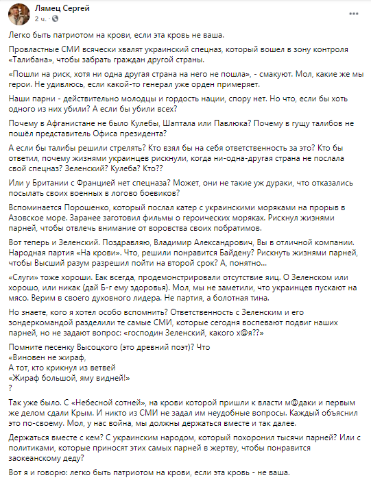 "Провластные СМИ всячески хвалят украинский спецназ, который вошел в зону контроля "Талибана", чтобы забрать граждан другой страны. "Пошли на риск, хотя ни одна другая страна на него не пошла", - смакуют. Мол, какие же мы герои. Не удивлюсь, если какой-то генерал уже орден примеряет. Наши парни - действительно молодцы и гордость нации, спору нет. Но что, если бы хоть одного из них убили? А если бы убили всех?
