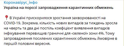 В Telegram-канале Минздрава сегодня в очередной раз сообщили, что Украина находится на пороге введения карантинных ограничений. Коэффициенты ухудшаются, так что усиление карантина не исключено уже в первой половине сентября.