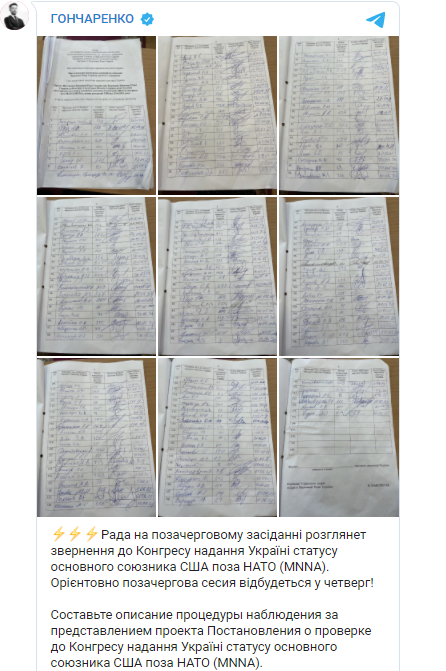 "Рада на внеочередном заседании рассмотрит обращение к Конгрессу о предоставлении Украине статуса основного союзника США вне НАТО (MNNA). Ориентировочно внеочередная сессия состоится в четверг!" - говорится в сообщении.