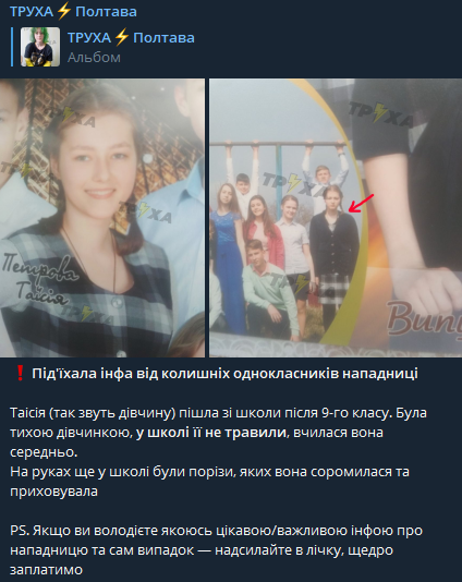 По данным паблика, зовут девушку Таисия. Она ушла из школы после 9-го класса. Кроме того, как рассказывают в паблике, во время учебы в образовательном учреждении она была тихой девочкой. При этом в школе она страдала от буллинга.