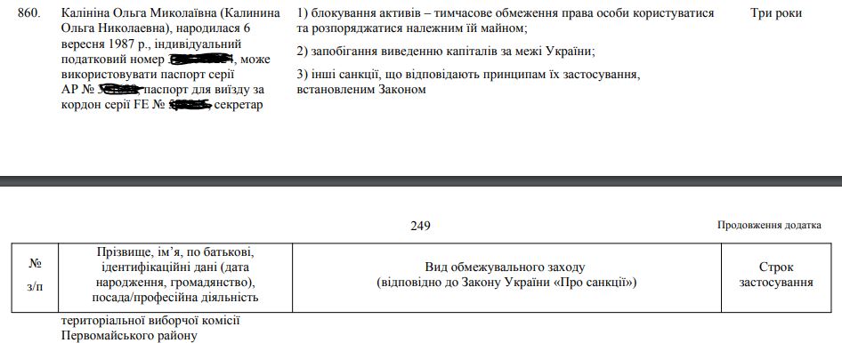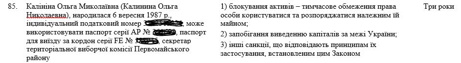 Там были раскрыты персональные данные сотрудницы киевского института (номер паспорта, загранпаспорт, ИНН), вот только было написано, что она секретарь территориальной избирательной комиссии Первомайского района Крыма. Санкции вводились на три года.