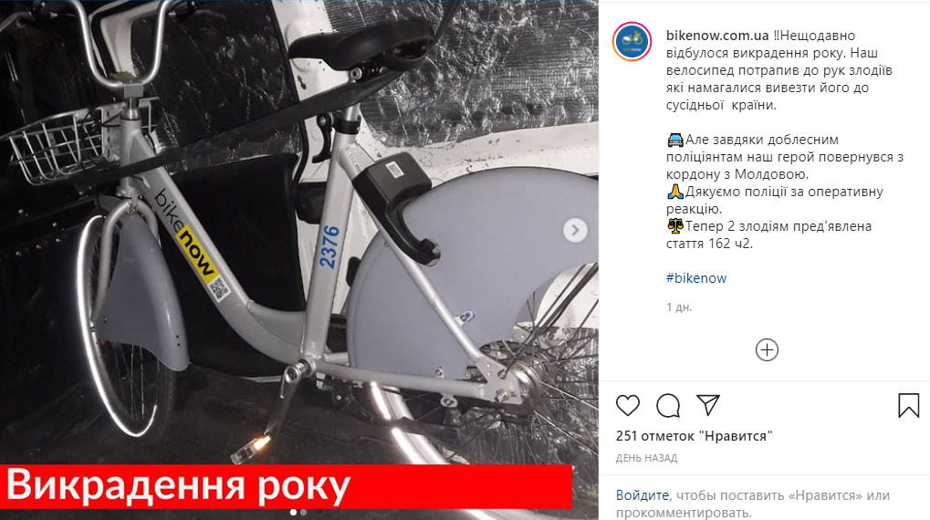 "Недавно произошло похищение года. Наш велосипед попал в руки воров которые пытались вывезти его в соседнюю страну. Но благодаря доблестным полицейским наш герой вернулся с границы с Молдовой. Спасибо полиции за оперативную реакцию", - говорится в сообщении.