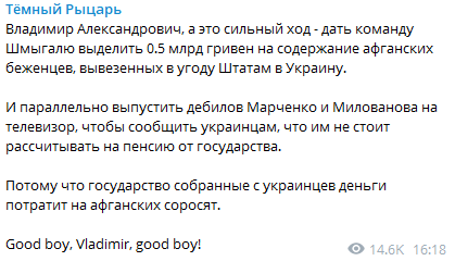 "Владимир Александрович, а это сильный ход - дать команду Шмыгалю выделить 0.5 млрд гривен на содержание афганских беженцев, вывезенных в угоду Штатам в Украину.