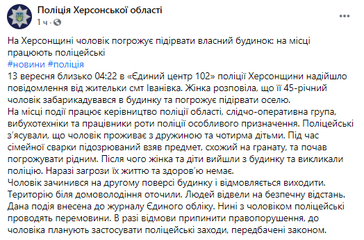В Херсонской области 45-летний местный житель после семейной ссоры закрылся на втором этаже собственного дома угрожает подорвать себя гранатой. Инцидент произошел в пгт Ивановка под утро в понедельник, 13 сентября. На месте работают правоохранители.
