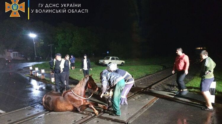 Инцидент произошел в городе Рожище. Конь попал в отверстие между путями и бетонной плитой. Спасатели, при помощи гидравлических ножниц увеличили промежуток между рельсом и плитой и спасли попавшее в ловушку животное. Во время освобождения коня остановили движение электропоезда "Ковель-Луцк".