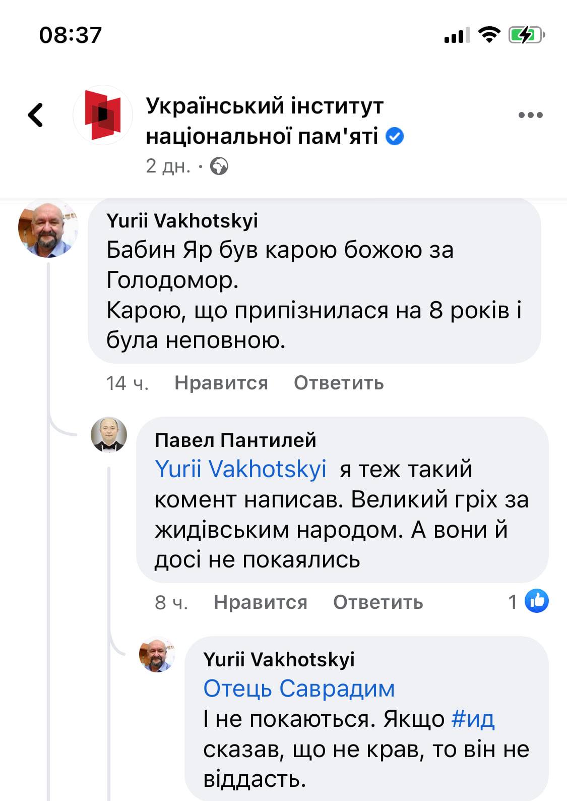 В Фейсбуке, в комментариях к одному из постов на странице Института Нацпамяти, Вахоцкий написал, что Бабий Яр - это "божья кара за Голодомор".