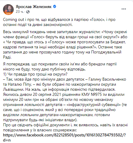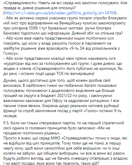 После того, как глава фракции "Голос" Ярослав Железняк обвинил группу народных депутатов из объединения "Справедливость" (часть нардепов "Голоса", взбунтовавшихся против руководства фракции - Ред.) в сговоре с Офисом президента, они направили письмо, в котором заявляют, что Железняк не может быть одновременно и главой фракции и первым замглавы комитета