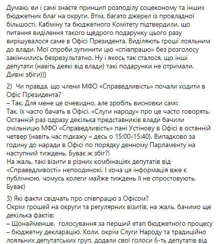 По его информации, которую он обнародовал в своем Фейсбуке, депутаты из группы "Справедливость" Галина Васильченко и Наталья Пипа получили минимум 20 млн гривен на избранные объекты на своих округах в качестве подарка от Офиса президента.