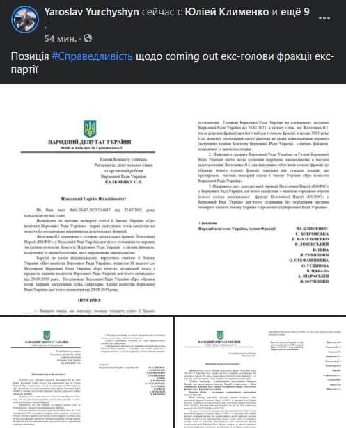 Как сообщил нардеп от фракции "Голос" Ярослав Юрчишин на своей странице в Facebook, после заявлений Железняка депутаты из "Справедливости" направили письмо на имя главы регламентного комитета Сергея Кальченко и спикера Верховной Рады Дмитрия Разумкова.