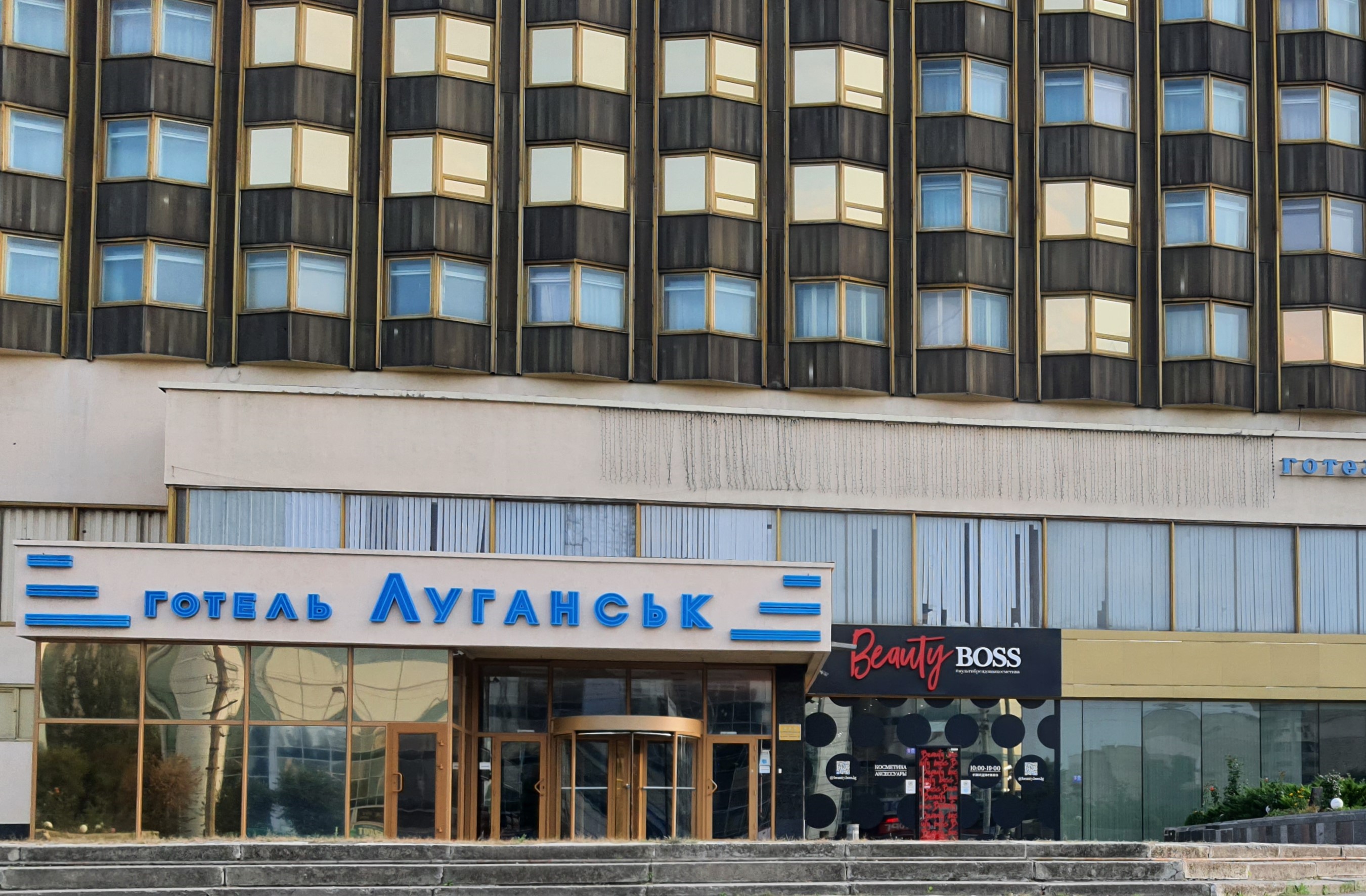 Фото: вывеска "Готель Луганськ", которая появилась на фасаде центральной гостиницы в конце нулевых, осталась без изменений.