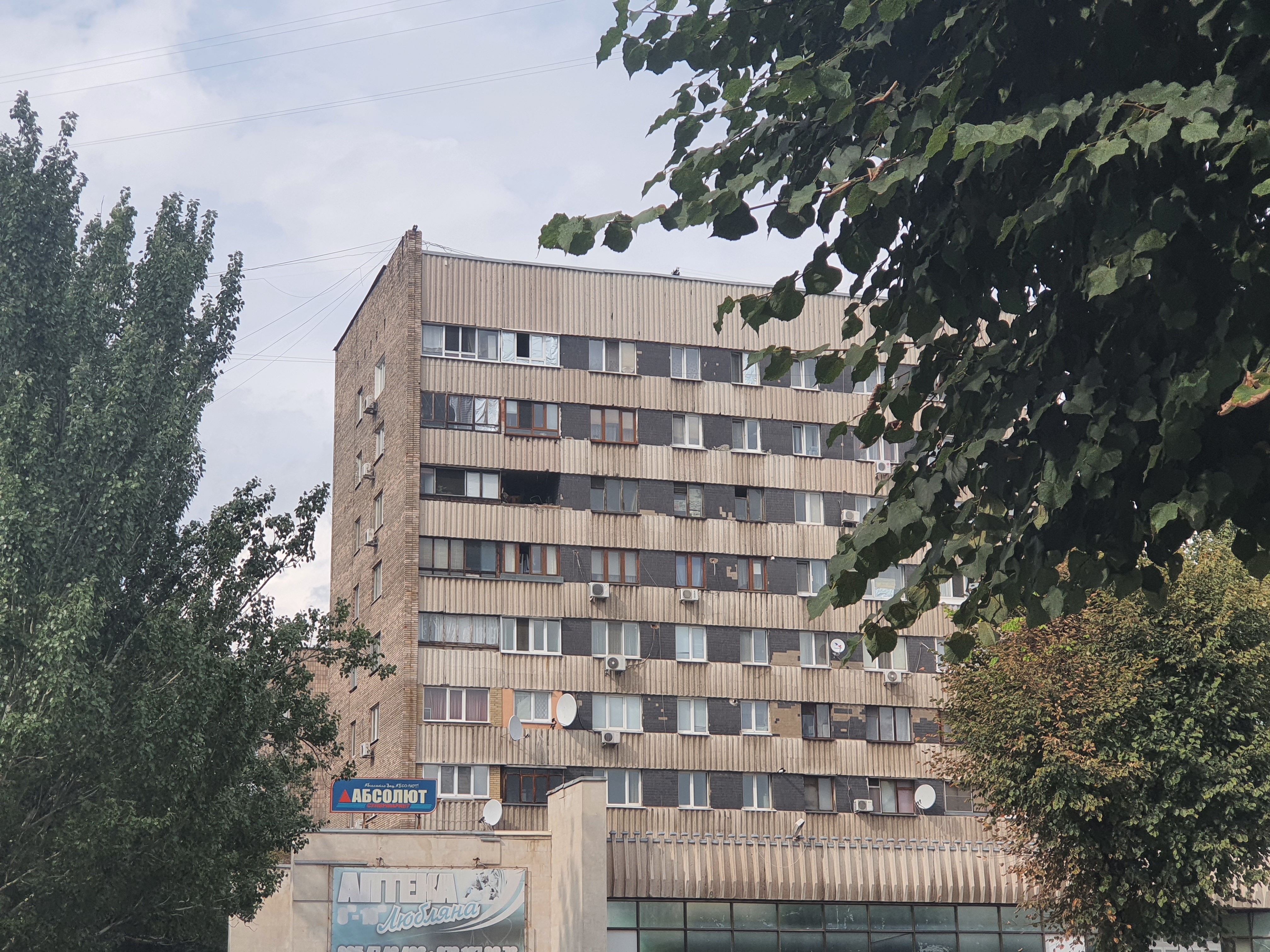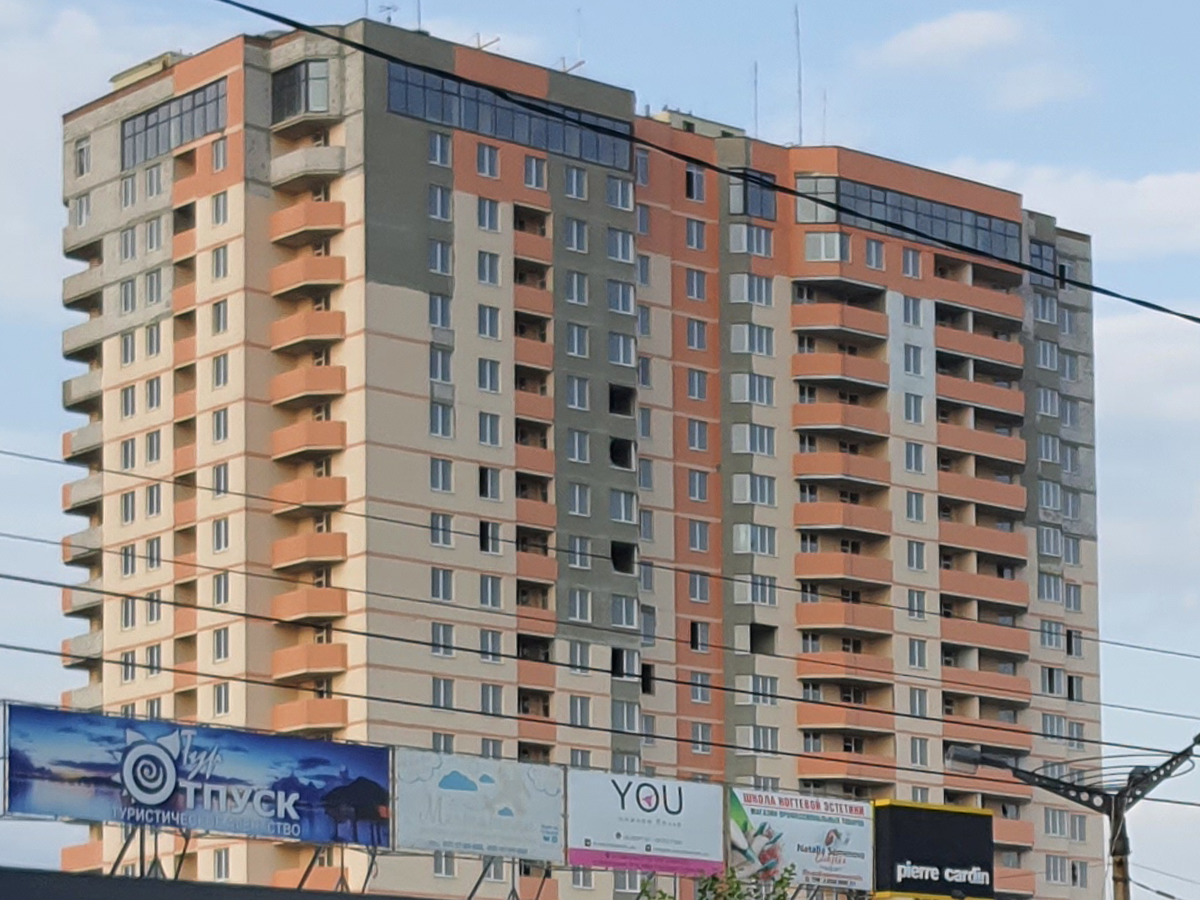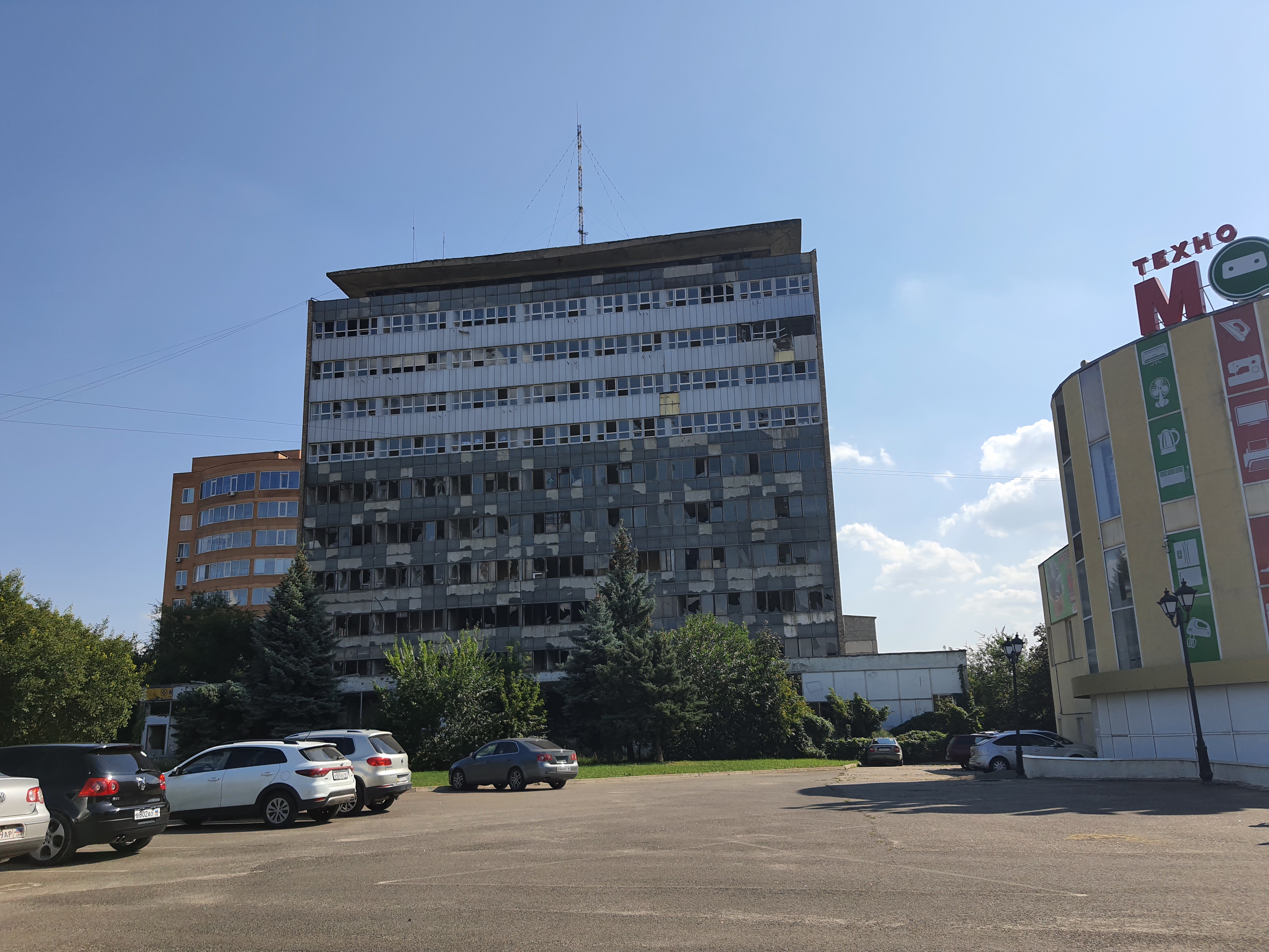 О достройке 25-этажного дома компания-застройщик сообщила 18 марта 2014 года, фактически, за месяц до начала АТО. По понятным причинам в эксплуатацию тогда постройку никто не принял. Летом в многоэтажку попадали снаряды. Сейчас 25-этажное здание несет на себе следы разрушений.