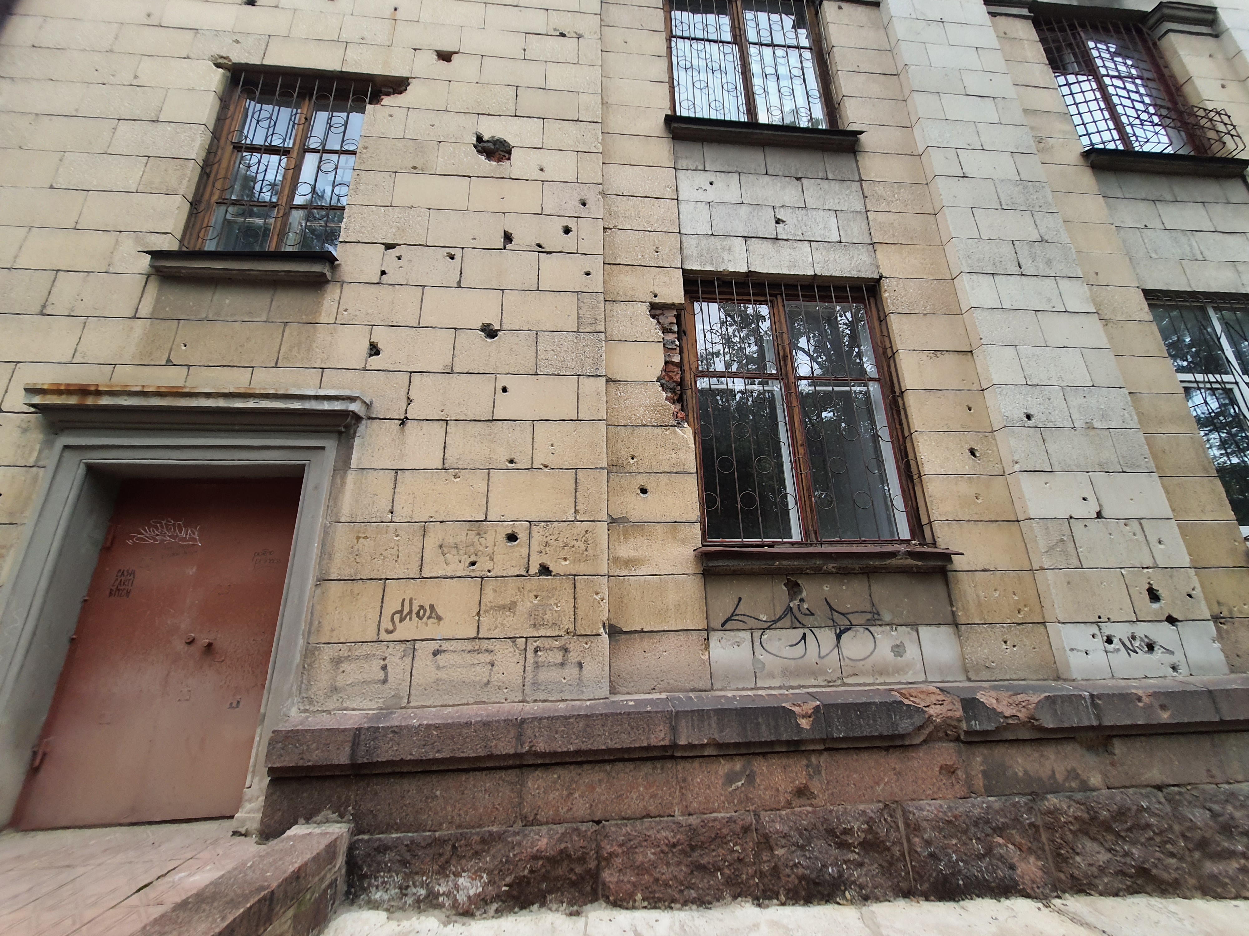 Бывшее областное управление МВД пострадало от обстрелов во время активных боевых действий. Есть следы повреждений и на облицовке здания института культуры, расположенного напротив. По характеру повреждений можно представить, какой была сила осколков