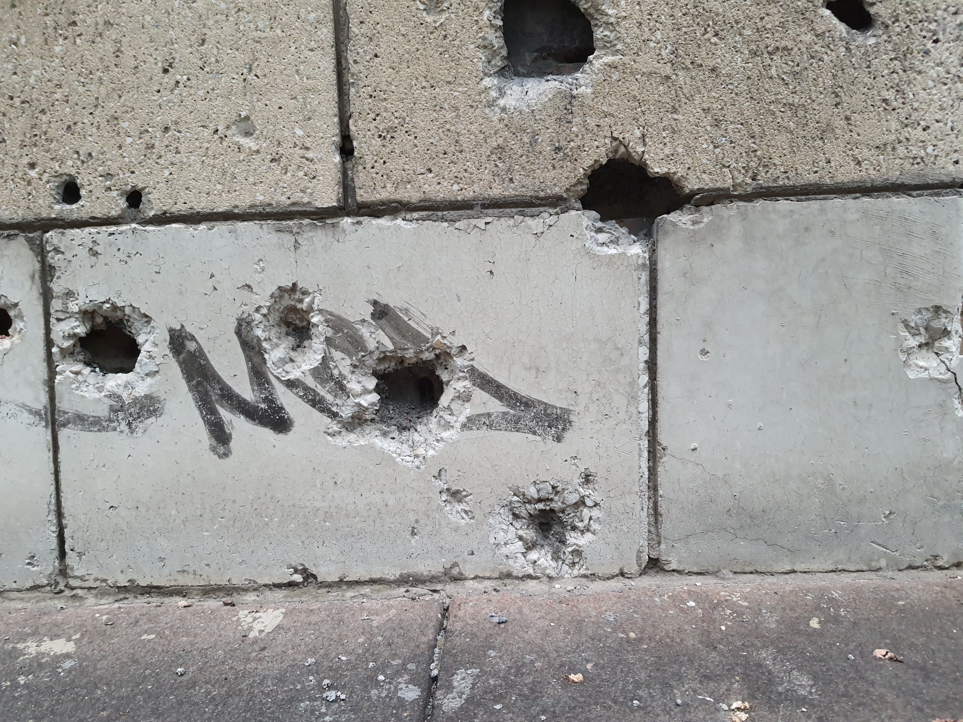 Фото: граффити с медведем в центре города. Справа и слева видны замазанные граффити вандалов.