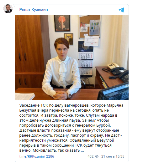 "Слугам народа в этом деле нужна длинная пауза. Зачем? Чтобы попробовать договориться с генералом Бурбой. Даст нужные власти показания - ему вернут отобранные ранее должность, госдачу, паспорт и охрану. Не даст - неприятности умножатся. Объявленный Безуглой перерыв в таком сообщении ТСК будет тянуться вечно. Моновласть, так сказать ...", - написал Кузьмин в соцсети.