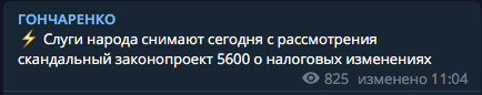 11:05 Нардеп от ЕС Алексей Гончаренко написал, что "слуги народа" снимают сегодня с рассмотрения скандальный законопроект 5600 о налоговых изменениях.