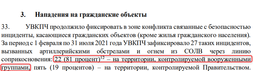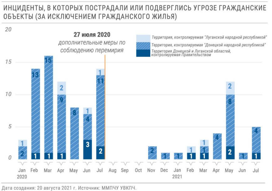 Очень наглядно показывается, кто обстреливает объекты гражданской инфраструктуры, на этом графике, который охватывает 2020 и 2021 годы. Здесь видно, что подавляющее большинство гражданских объектов подвергается ударам именно на неподконтрольных территориях.