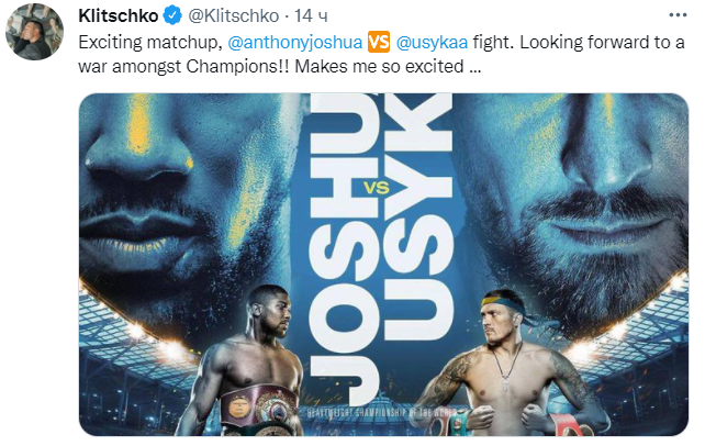 "Интересное противостояние Джошуа и Усика. Я нахожусь в ожидании очередной чемпионской борьбы. Это очень волнительно для меня", - написал Кличко-младший.