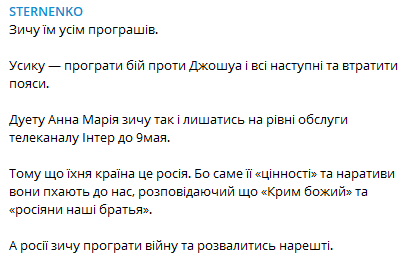 Дуэту Анна Мария желаю так и оставаться на уровне обслуги телеканала Интер до 9 мая