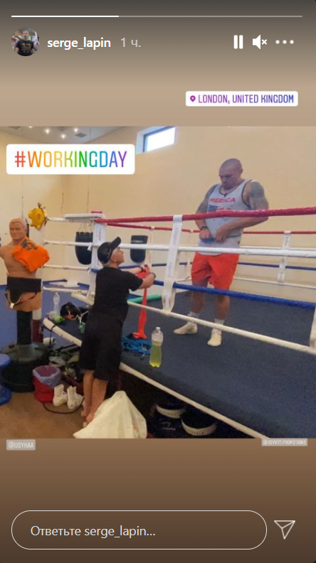 "Рабочий день", - подписал снимок Сергей Лапин. На фото Анатолий Ломаченко дает указания Усику, стоящему в ринге. То есть, скорее всего, основной поддержкой в углу поединка у Усика будет именно Ломаченко-старший.