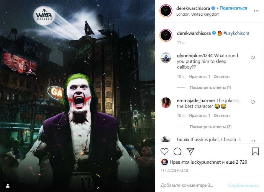 Интересно, что этот образ Усик взял на вооружение после победы над Чисорой. Это его оппонент распространил в сети постер, на котором Александр был в образе негодяя-Джокера, а Дерек в образе Бэтмена. По задумке команды Чисоры, добро должно было победить зло.