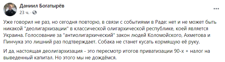 "Уже говорил не раз, но сегодня повторю, в связи с событиями в Раде: нет и не может быть никакой "деолигархизации" в классической олигархической республике, коей является Украина. Голосование за "антиолигархический" закон людей Коломойского, Ахметова и Пинчука это лишний раз подтверждает. Собака не станет кусать кормящую её руку.