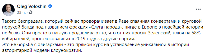 "Такого беспредела, который сейчас проворачивает в Раде спаянная конвертами и круговой порукой банда под названием фракция "Слуга народа", нигде в Европе в новейшей истории не было. Они просто в наглую продавливают то, что от них просит Зеленский, плюя на 58% избирателей, проголосовавших в 2019 году за другие партии.