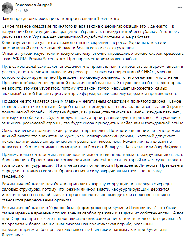 "Этот закон отныне закрепил переход Украины к жесткой авторитарной системе личной власти Зеленского и его окружения", - пишет Головачев. Но, по его мнению, даже не это является самым главным негативным следствием принятого закона.