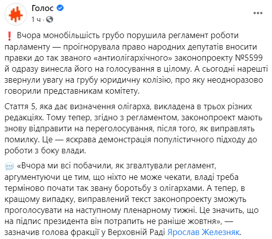 При этом, напомним, 11 нардепов от "Голоса" поддержали закон, после чего руководство фракции обвинило их в работе на Офис президента.