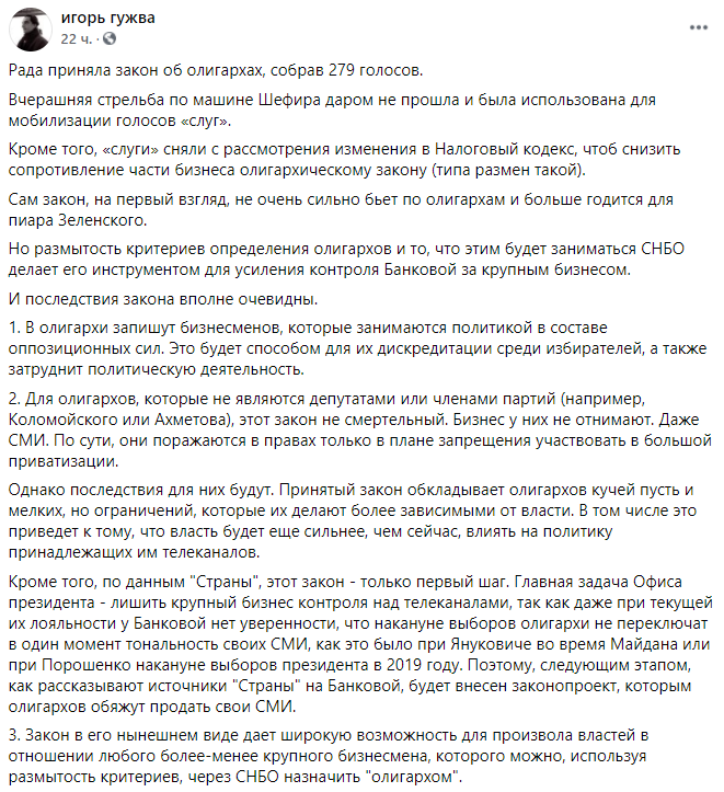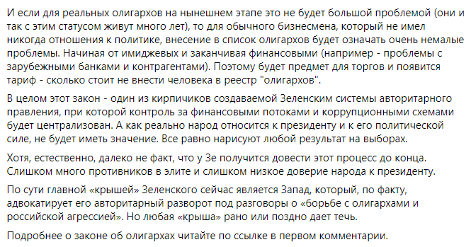 Сам закон, на первый взгляд, не очень сильно бьет по олигархам и больше годится для пиара Зеленского. Но размытость критериев определения олигархов и то, что этим будет заниматься СНБО делает его инструментом для усиления контроля Банковой за крупным бизнесом.