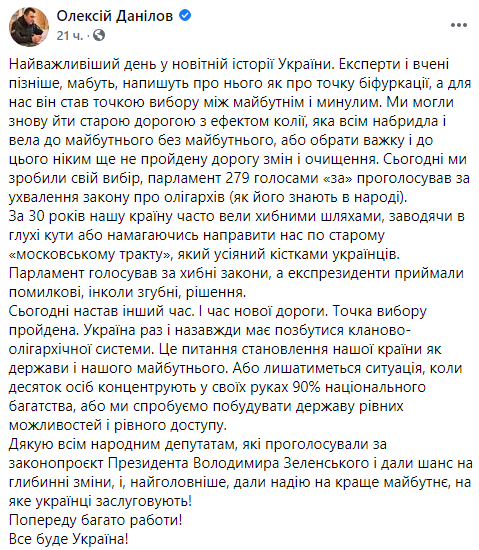 Секретарь СНБО Алексей Данилов - а ныне "главный по олигархам" - еще больше фонтанировал пафосным позитивом. Он заявил, что это "самый важный день в новейшей истории Украины".