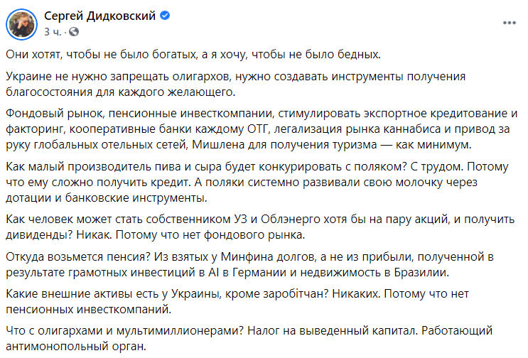 "Украине не нужно запрещать олигархов, нужно создавать инструменты получения благосостояния для каждого желающего.