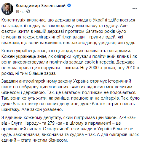 Президент Зеленский - автор закона - заявил о том, что "каждый украинец знает, кто эти люди, которых называют олигархами". Они, по словам президента, "покупали политическое влияние и использовали политиков ради своих интересов".