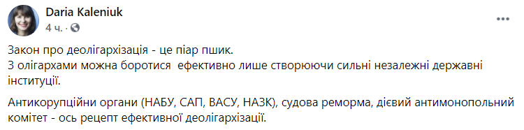 "Закон о деолигархизации - это пиар пшик. С олигархами можно бороться эффективно, только создавая сильные независимые государственные учреждения. Антикоррупционные органы (НАБУ, САП, ВАСУ, НАЗК), судебная реформа, действенный антимонопольный комитет - вот рецепт эффективной деолигархизации", - пишет глава "Центра противодействия коррупции" Дарья Каленюк.