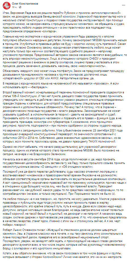 "Итак, Верховная Рада все же решила перейти Рубикон и приняла "антиолигархический" закон, не дожидаясь выводов Венецианской комиссии. Украинский парламент вытер ноги о несколько статей Конституции и подарил главе государства инструментарий, при помощи которого можно, не заморачиваясь с процессуальными моментами, не обращаясь к судам, преследовать любого лидера оппозиции – а они практически все подпадают под предложенное определение "олигарха".