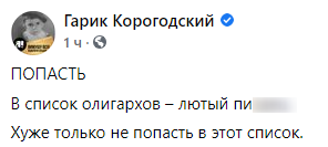 "Попасть в список олигархов – лютый п@дец. Хуже только не попасть в этот список", пишет он.