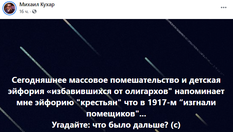 "Сегодняшнее массовое помешательство и детская эйфория "избавившихся от олигархов" напоминает мне эйфорию "крестьян", что в 1917-м "изгнали помещиков"...