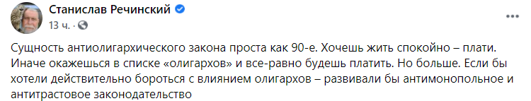 "Сущность антиолигархического закона проста, как 90-е. Хочешь жить спокойно – плати. Иначе окажешься в списке "олигархов" и все-равно будешь платить. Но больше. Если бы хотели действительно бороться с влиянием олигархов – развивали бы антимонопольное и антитрастовое законодательство", - считает журналист Станислав Речинский.