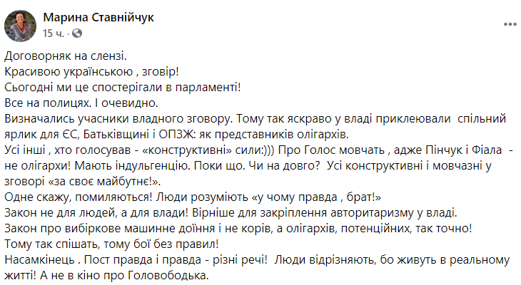 "Закон не для людей, а для власти. Вернее, для закрепления авторитаризма во власти. Закон об избирательном машинном доении и не коров, а олигархов, потенциальных, так точно! Поэтому так спешат, поэтому бои без правил!" - пишет блогер Марина Ставнийчук.