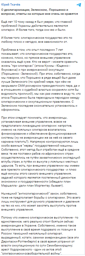 "Олигархическое государство это, конечно, плохо, но прямое внешнее управление оказалось ещё хуже. Кто не верит - можете сравнить жизнь "при олигархах" (эпоха Кучмы - Ющенко - Януковича) и при американской оккупации (Порошенко - Зеленский)", - считает Ткачев.