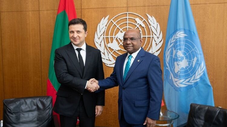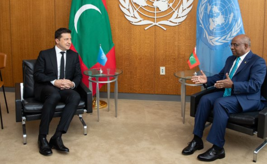 На одном из снимков запечатлена беседа Владимира Зеленского и Абдуллы Шахида. При этом за спиной председателя 76-й сессии Генассамблеи ООН флаг ООН, представляющий собой изображение официальной эмблемы Организации, а за спиной украинского президента - флаг Мальдив (красное полотнище с зелёным прямоугольником в центре, на котором изображён полумесяц.